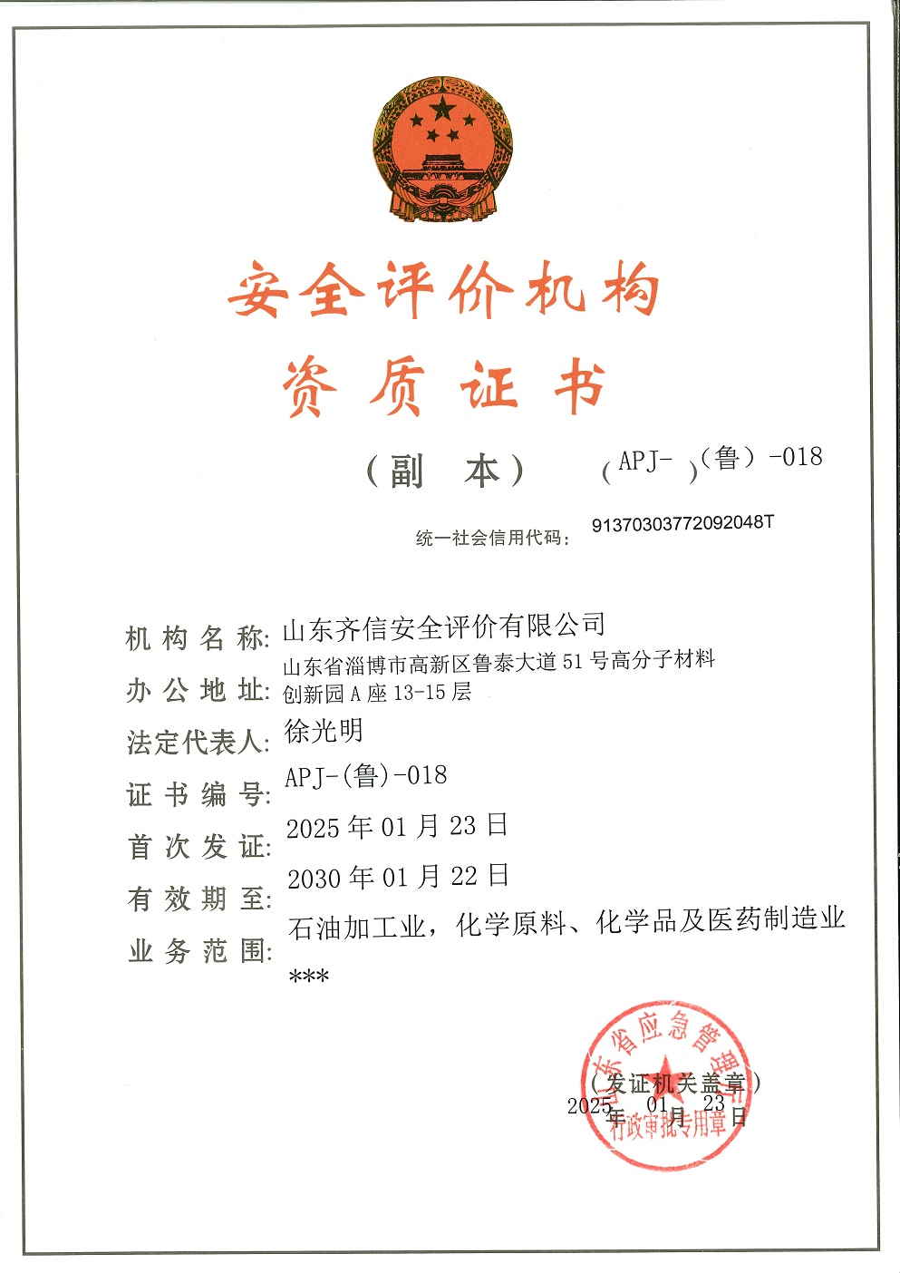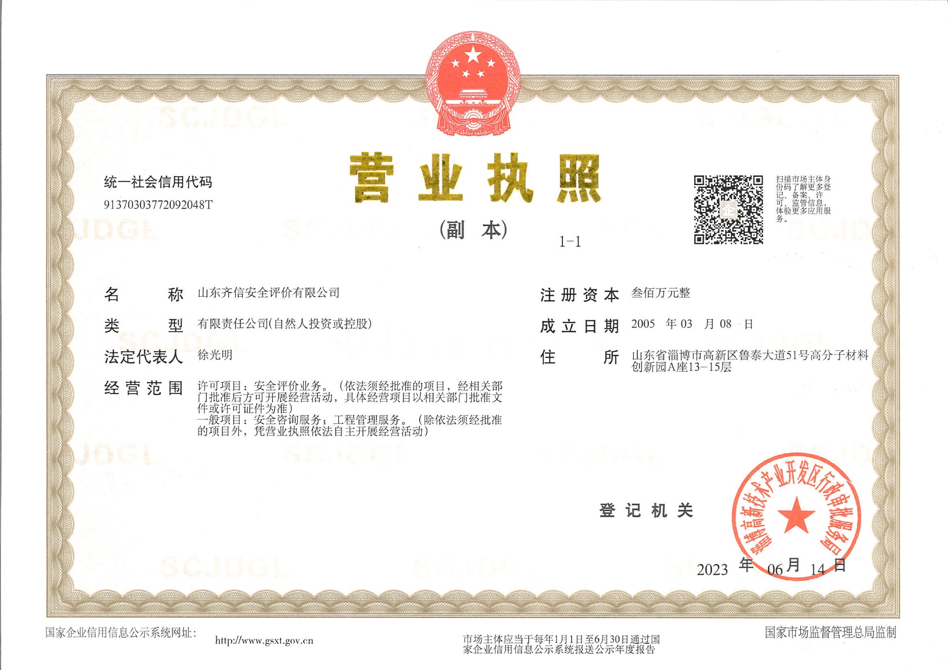 山东古天乐太阳集团城入口安全评价有限公司成立于2005年3月,注册资本300万元人民币,固定资产总值804.8728万元。法定代表人徐光明,注册地址及办公地址位于淄博高新区鲁泰大道51号高分子材料创新园A座13-15楼。2005年9月取得安全评价机构乙级资质。自国家应急部1号令实施以来,公司于2020年1月15日取得新安全评价资质,业务范围包括:陆上油气管道运输业;石油加工业,化学原料、化学品及医药制造业;金属冶炼。2018年12月21日取得安全生产标准化二级评审单位,评审范围:危险化学品、纺织、建材、轻工、冶金、机械。 公司现有人员41人,其中专职安全评价师37人,注册安全工程师26人,研究员1人、硕士5人、双学士1人,山东省安全专家库专家1人、教授级高工1人,高级工程师8人、工程师22人,专职危险化学品标准化评审员、工商贸标准化评审员30人,本科以上学